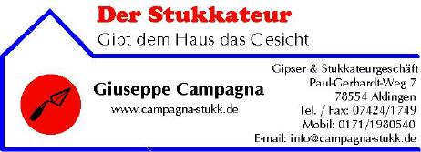 Vor einigen Jahren hatte ich mich dazu entschlossen, mich selbstständig zu machen. Aller Anfang war natürlich schwer, und mit einem kleinen Lastwagen und 1Mitarbeiter erledigten wir unsere Aufträge zuverlässig und Anspruchsvoll. Doch als wir durch unsere überzeugende Kompetenz und Qualität mehr und mehr Aufträge sichern konnten, wurden wir in schnellster Zeit ein Unternehmen mit großem Fuhrpark, Maschinen und derzeit 7 Mitarbeitern. Nun kann man aber natürlich viel erzählen und schreiben, wir möchten Sie daher einladen Sich auf den folgenden Seiten ein eigenes Bild zu verschaffen und wir hoffen auch Sie gehören bald zu unseren zufriedenen Kunden. Ihr Stukkateur. Giuseppe Campagna.